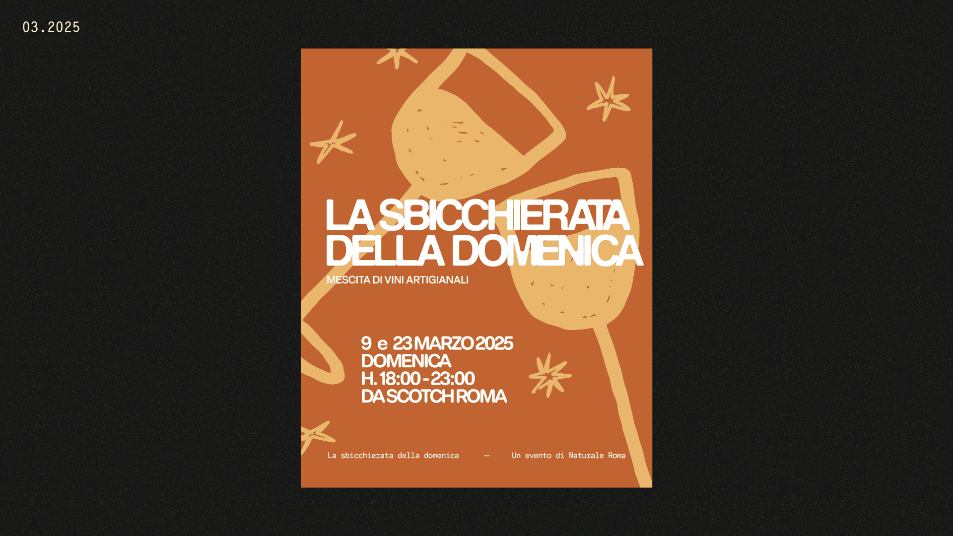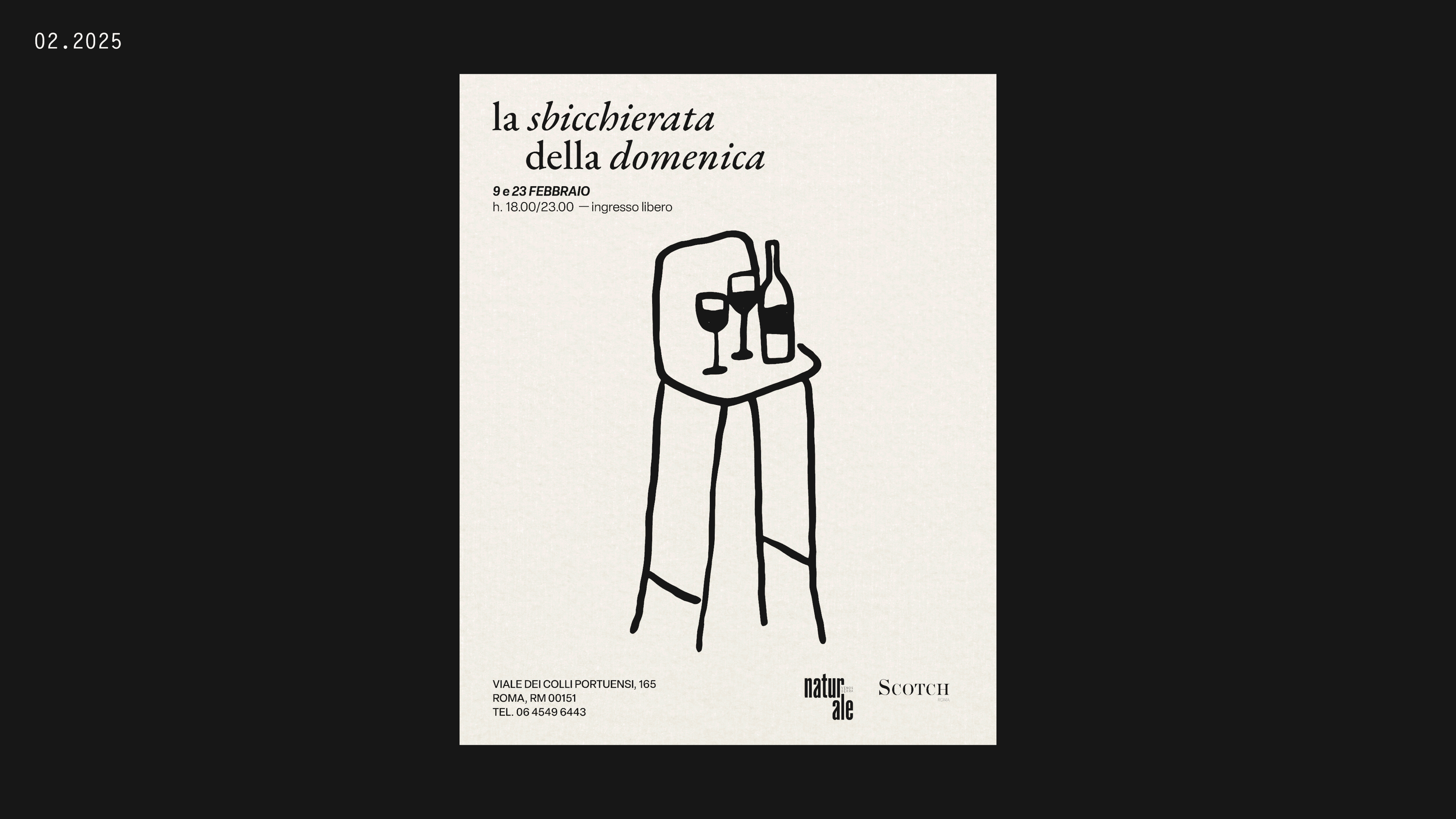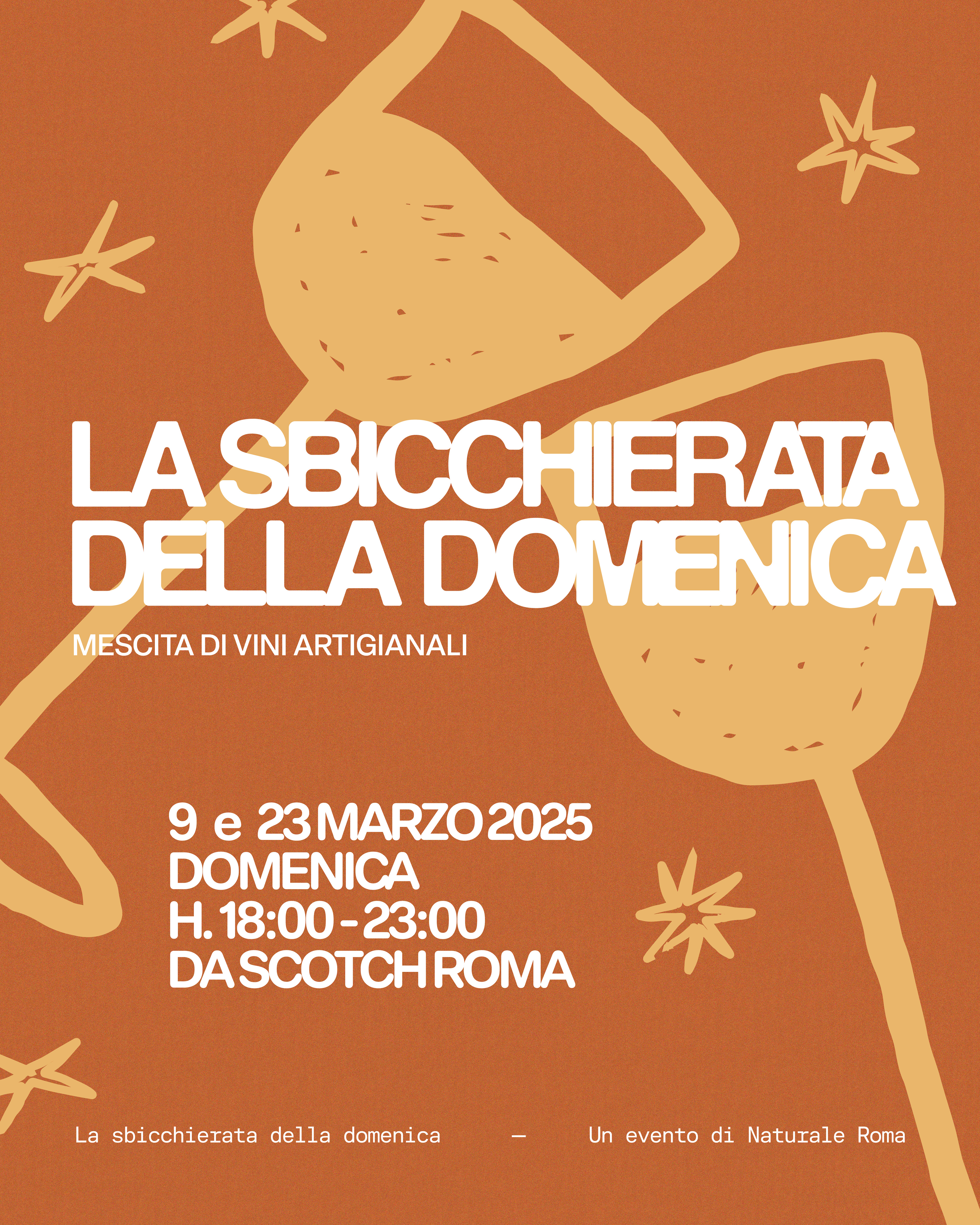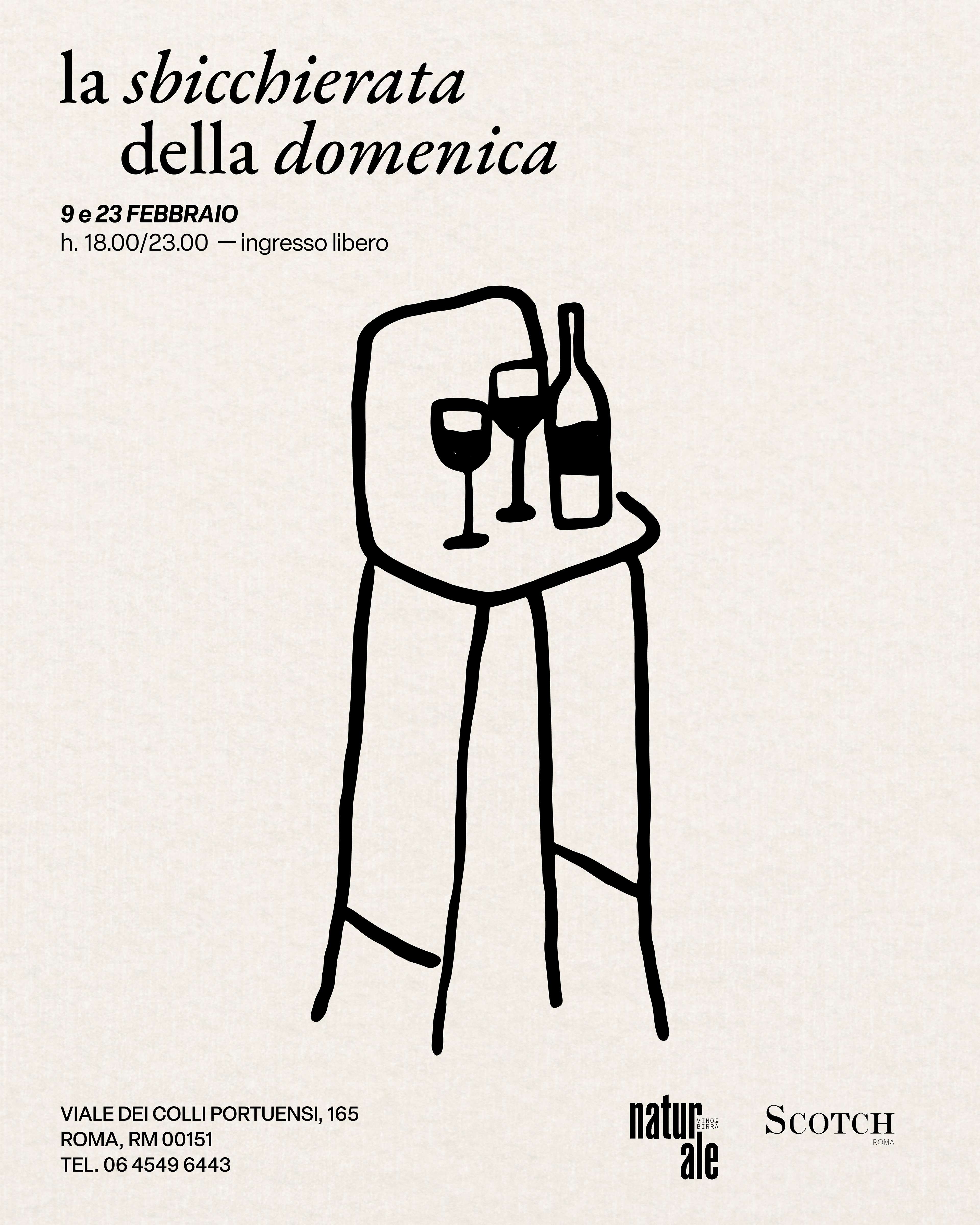 La Sbicchierata della Domenica, mescita di vini artigianali. Un evento di Naturale Roma e Scotch Roma. Un progetto di comunicazione che parla la lingua dell’incontro e del buon bere.